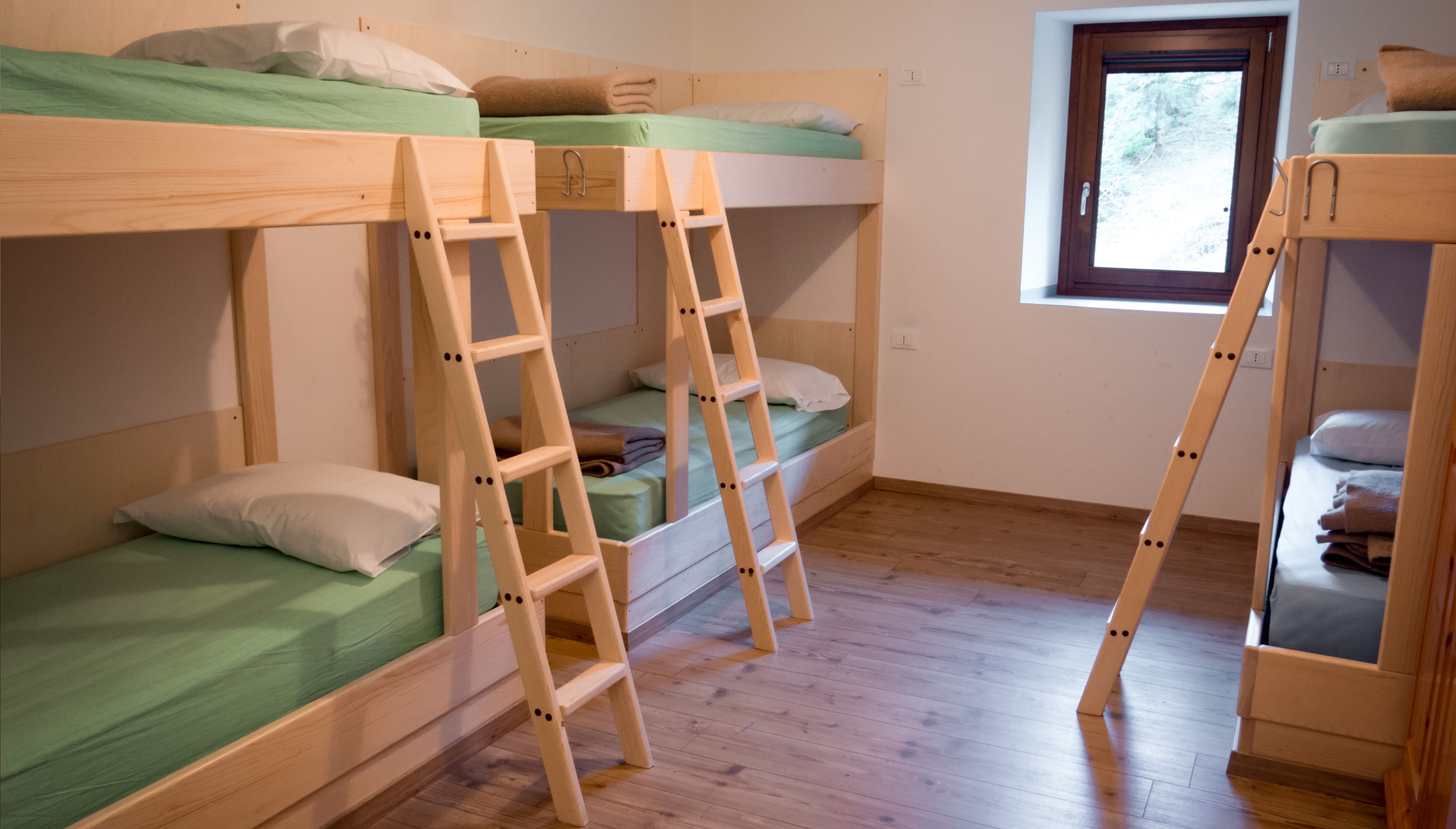 La camerata del secondo piano conserva le caratteristiche del rifugio: 12 posti letto con obbligo di utilizzo sacco a pelo o sacco lenzuolo personale (a disposizione anche sacchi lenzuola usa e getta a € 5,00).